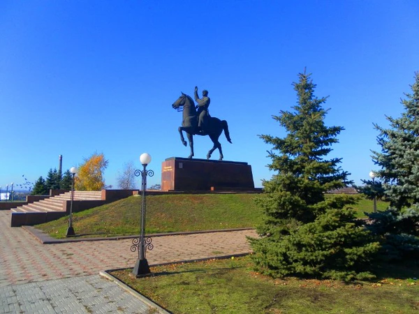 Памятник представляет собой фигуру Ворошилова на коне в будёновке и солдатской шинели, с поднятой рукой. Высота бронзовой скульптуры достигает 9 метров, высота гранитного пьедестала — 3 метра. На постаменте бронзовыми буквами содержится надпись на русском: «Ворошилов Климент Ефремович»[2].