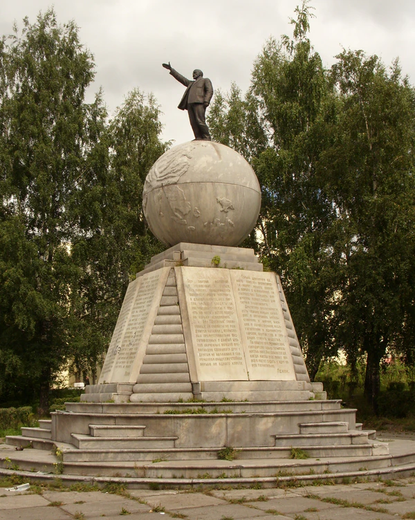 Памятник Ленину представляет собой выполненное из бронзы скульптурное изображение Владимира Ильича с протянутой вперёд правой рукой, стоящего на гранитной модели Земного шара. Сам шар в свою очередь установлен на постамент в виде усечённой пирамиды, на каждой из четырёх граней которой изображены раскрытые книги с цитатами из сочинений вождя[3].