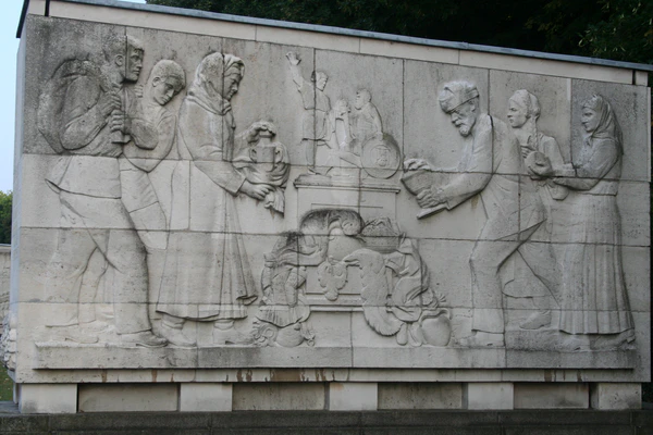 В берлинском Трептов-парке на одном из 16 саркофагов советского военного мемориала высечен барельеф «Всё для фронта! Всё для победы!». На нём изображен памятник Минину и Пожарскому, перед которым стоят люди, жертвующие своё имущество для поддержки армии в тылу. Эта композиция повторяет сюжет оригинального барельефа[107].