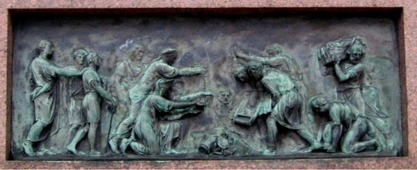 В окончательном варианте пьедестал, выполненный из красного финляндского гранита и украшенный бронзовыми барельефами, претерпел некоторые изменения. Фронтальный барельеф стал лаконичнее, количество фигур уменьшилось. Женщины с левой стороны и мужчины с правой подносят пожертвования. По сравнению с первым вариантом фигуры стали значительнее. Позы женщин выражают торжественность происходящего. Преклонив колено, они плавным движением рук возлагают украшения на алтарь Отечества. Женская одежда напоминает античную, но на головах русские кокошники. За фигурами женщин стоит отец, отдающий в ополчение двух сыновей. Здесь скульптор изобразил себя вместе с детьми. Ученик Мартоса Самуил Гальберг выполнил профильный портрет своего учителя с сыновьями[22][33]. Оба сына скульптора попали на барельеф не случайно. Один — Алексей Иванович — в 1812 году сражался в армии Кутузова, другой — Никита Иванович — был задержан и убит наполеоновскими солдатами во Франции, когда находился там в качестве пенсионера Академии художеств[5][10].