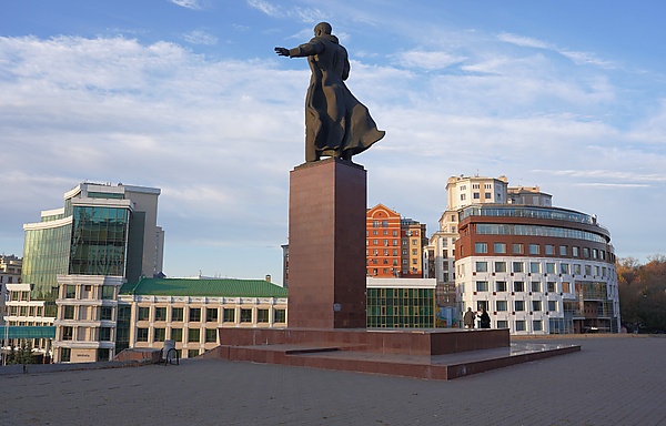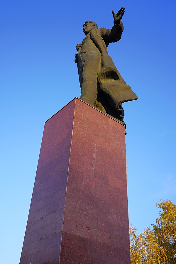 …в монументе очень ярко, торжественно выражена героическая составляющая темы. Основой пластического решения является выигрышный силуэт: вся фигура, к низу утяжелённая драпирующимися складками шинели, кажется летящей, устремлённой вперёд. Вторит ритму скульптуры жест взметнувшейся вперёд руки. Пластика лепки адекватна самой задаче символического памятника — крупные массы бронзы в своей текучести придают всему образу большой динамизм и вихреобразное развитие.