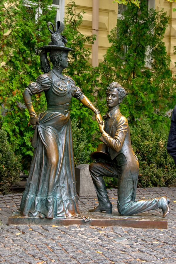 Памятник расположен вблизи Андреевской церкви, где происходили съемки финального эпизода фильма. Популярен среди молодожёнов, несмотря на судьбу изображённых персонажей[5].