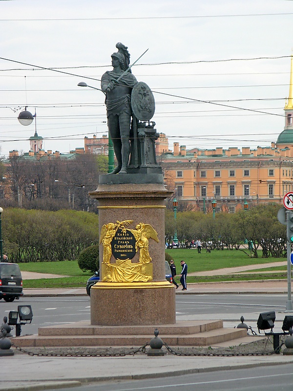 Император Павел I намеревался установить монумент перед южным фасадом Михайловского замка, однако Суворов в марте 1800 года впал в немилость. Тогда император вернулся к прежнему решению об установке перед фасадом Михайловского замка монумента Петру Великому. В итоге памятник фельдмаршалу Суворову установили на противоположной стороне Царицына луга (ныне Марсово поле) у реки Мойки[2].