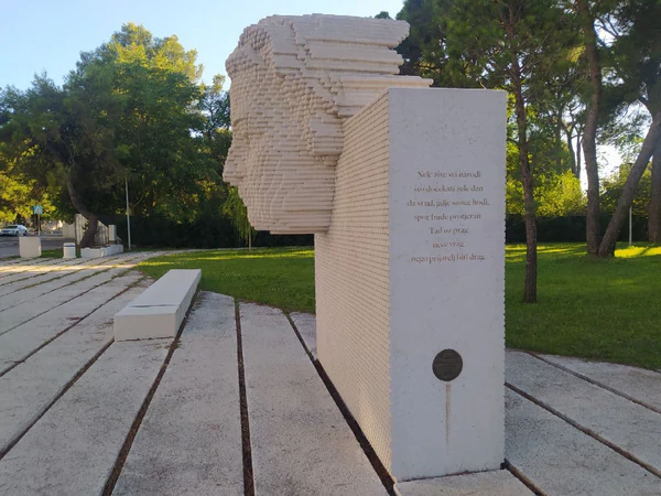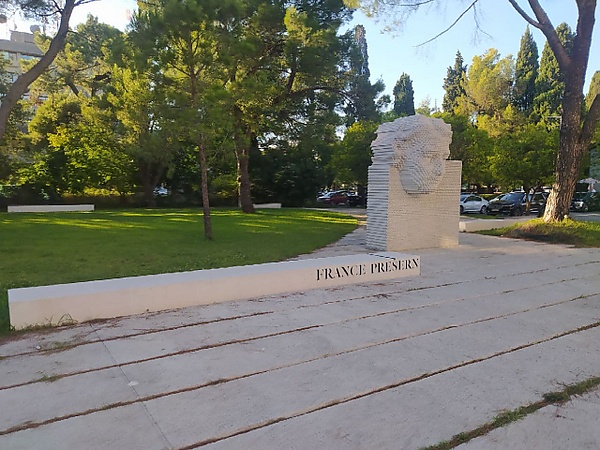 Необычный памятник из натурального и искусственного камня выполнен в виде гигантской головы словенского поэта, находящейся на постаменте.