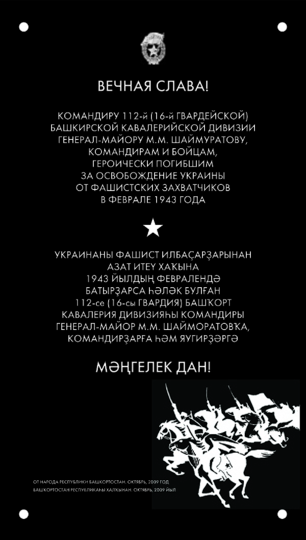 «112-я гвардейская Башки́рская кавалери́йская диви́зия» была создана по национально-региональному признаку для участия в Великой Отечественной войне в Уфе в декабре 1941 года. М.М. Шаймуратов командовал дивизией с 25 декабря, погиб 23 февраля 1943 года между поселками Штеровского динамитного завода имени Г. И. Петровского (Петровское) и Юлино (Штеровка) Ворошиловоградской области.