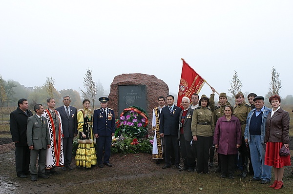 Решением городского совета г. Петровское в центре города был отведен специальный участок для создания сквера и установки памятного знака[2]. Памятник и сквер открыт 3 октября 2009 года в рамках акции по увековечению памяти погибших воинов 112-ой Башкирской кавалерийской дивизии и 110 летия со дня рождения М.М. Шаймуратова «Дорогами славных конников»[3]. Сквер представляет собой ландшафтный мемориальный комплекс, композиционным центром которого является «Памятник башкирским конникам». Памятник представляет собой гранитную глыбу высотой 1,8 м, установленной на подножии. На гранитной глыбе установлена вертикальная плита с надисью на русском и башкирском языках «Вечная слава! Командиру 112-й (16-й гвардейской) Башкирской кавалерийской дивизиитгенерал-майору М.М. Шаймуратову, командирам и бойцам, героически погибшим за освобождение Украины от фашистских захватчиков в феврале 1943 года» и высеченным рисунком скачущих кавалеристов.