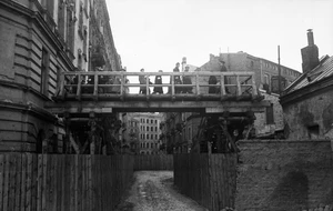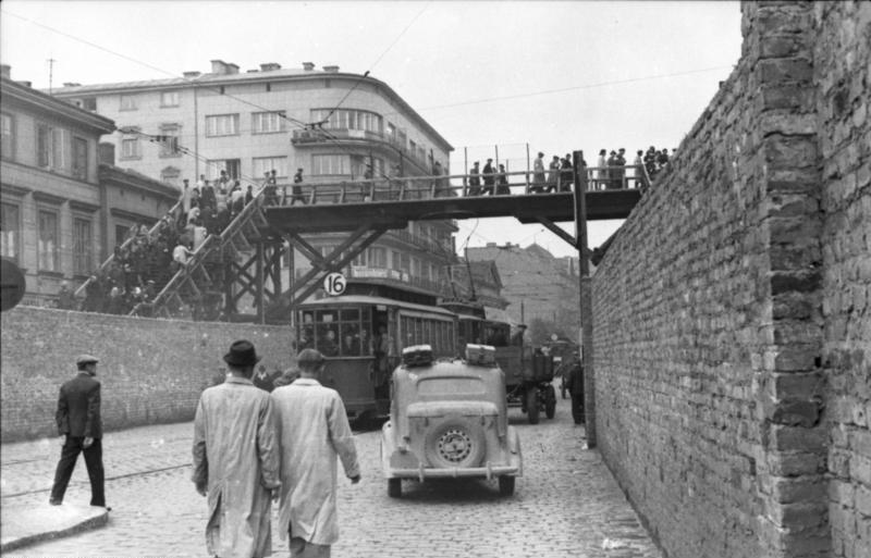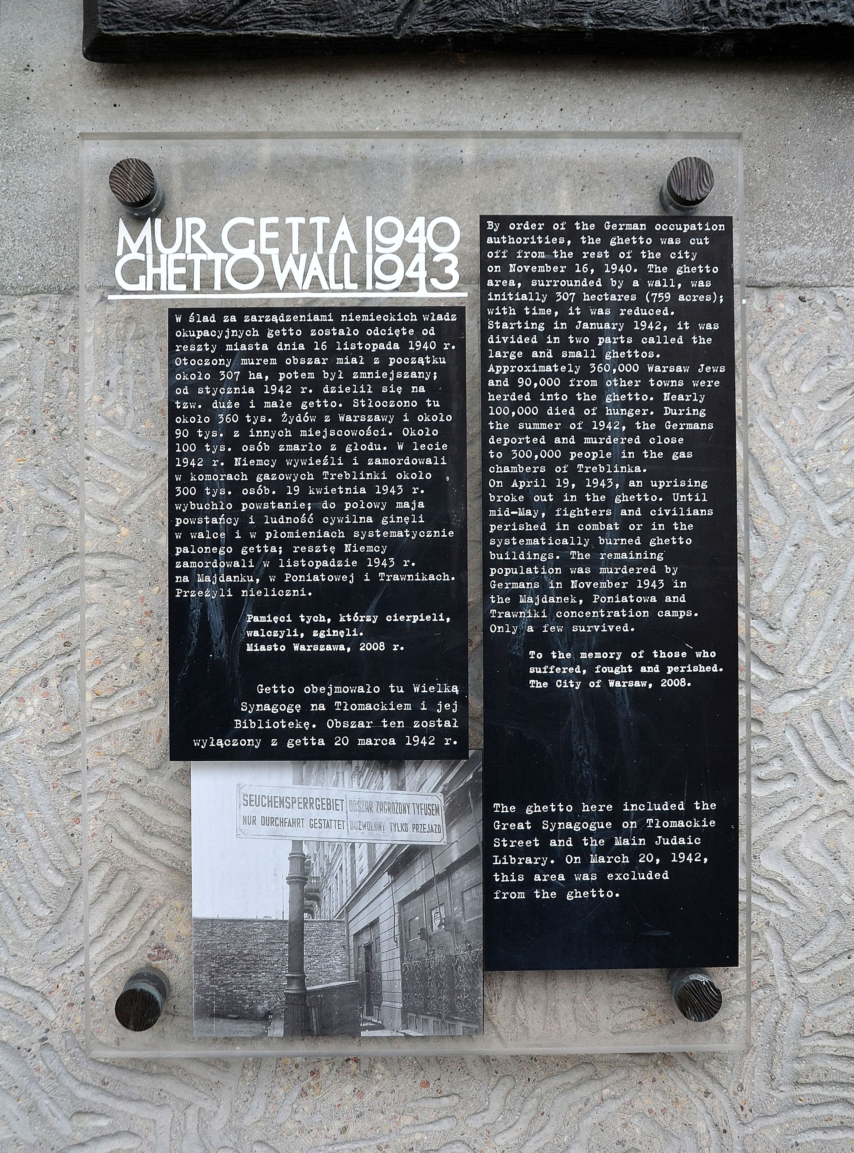 «Вслед за указами немецких оккупационных властей гетто было отрезано от остальной части города 16 ноября 1940 года. Окруженный стеной район имел сначала примерно в 307 га, потом был уменьшен; с января 1942 года. делился на так называемые большие и малые гетто. Здесь было согнано около 360 тысяч евреев из Варшавы и около 90 тысяч из других городов. Около 100 тысяч человек умерли от голода. Летом 1942 года немцы вывезли и сожгли в газовых камерах Треблинки около 300 тысяч человек. 19 апреля 1943 года вспыхнуло восстание, до середины мая повстанцы и мирное население гибли в бою и языках пламени систематически поджигаемого гетто. Остальных немцы убили в ноябре 1943 года в лагере смерти Майданек под Люблином и нацистском трудовом лагере в Травниках. Выжили немногие.