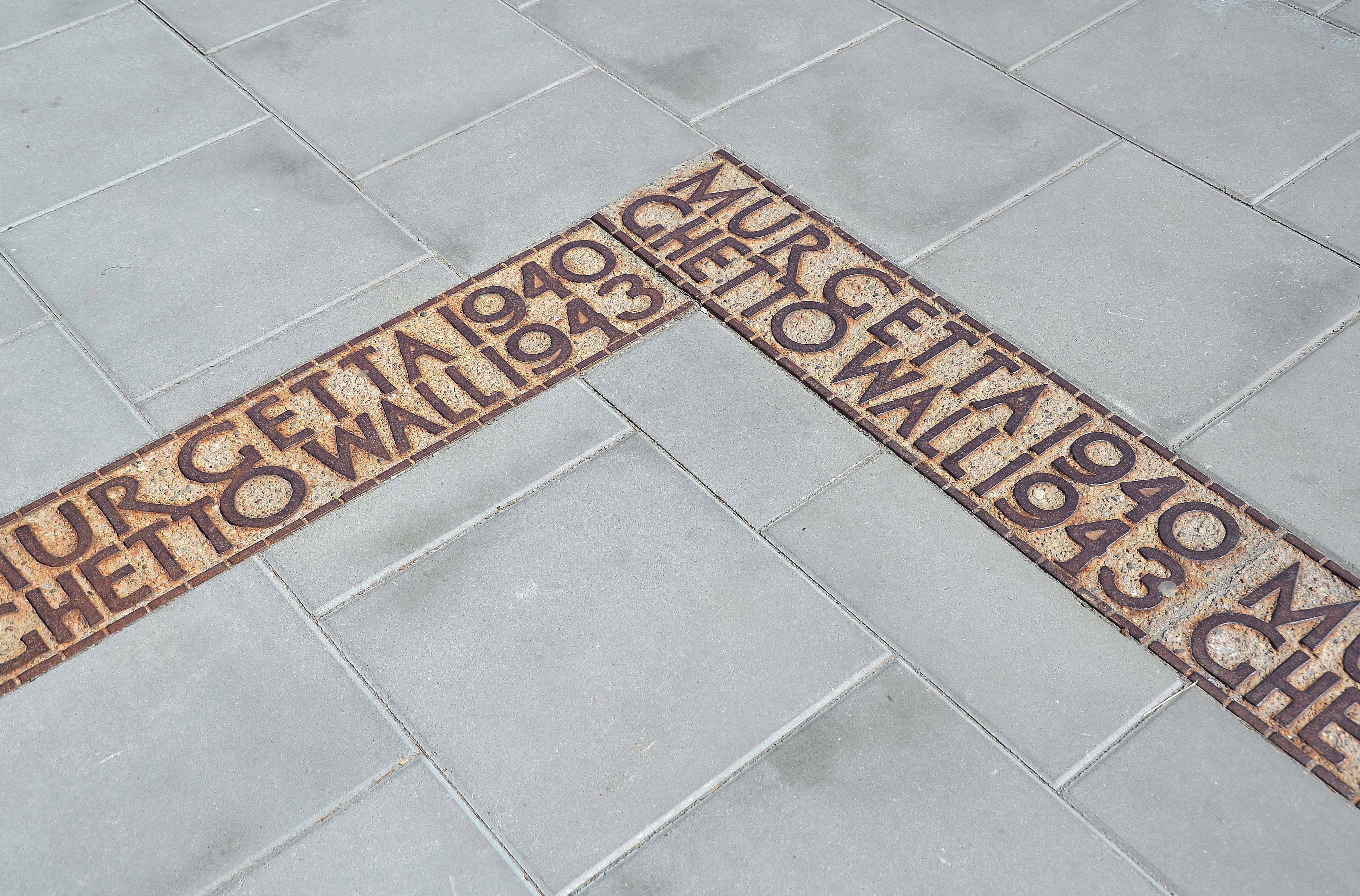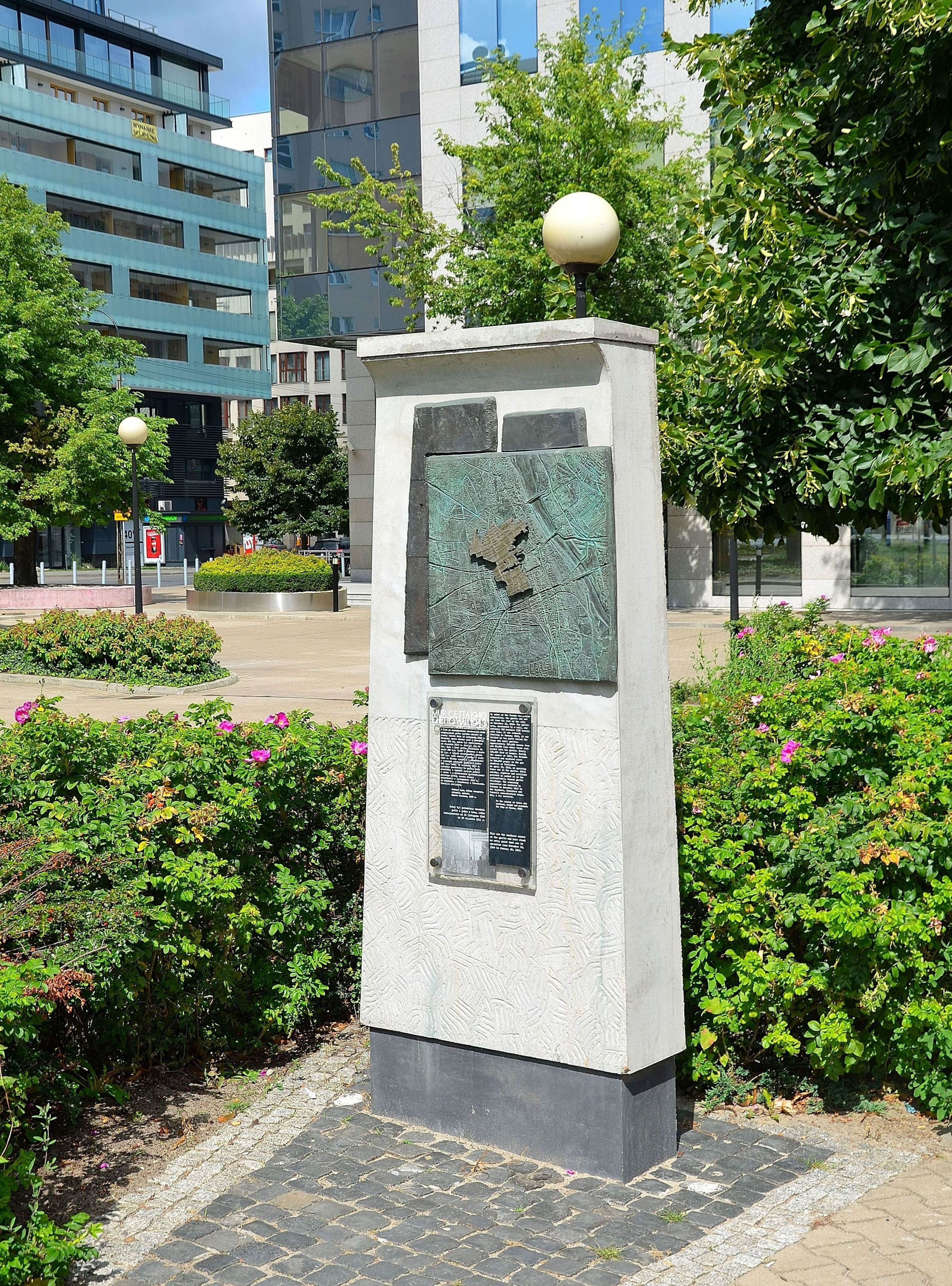 - бетонные плиты шириной 25 см, сделанные из чугуна, с двуязычной надписью «MUR GETTA 1940/GHETTO WALL 1943», расположенные на тротуаре или газоне, показывающие точное местоположение ближайших участков стены гетто. Дата 1940—1943 имеет символический характер, потому что большинство из упомянутых мест были исключены из гетто в 1941—1942 г.г., в свою очередь одно было включено в закрытую территорию в декабре 1941 г., а ещё два — в январе 1942 г..