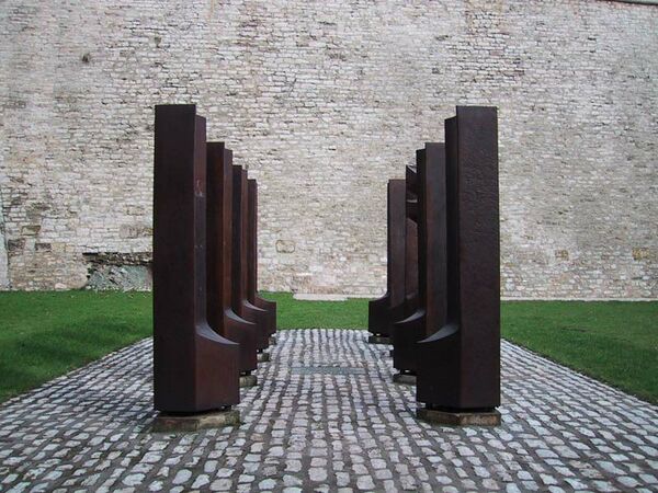 Скульптор использовал металлолом (бывшие отопительные котлы), поскольку это материал со следами износа. Сталь напоминает о сражениях Второй мировой войны. Расположение стел в виде узкой аллеи создаёт ощущение беспокойства, единообразия, и безнадёжности.