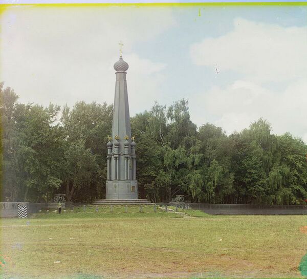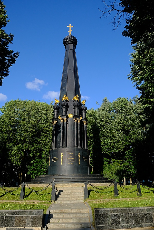 В 1835 году Николай I повелел установить 16 типовых чугунных монументов в местах важнейших сражений. Памятники были разбиты на три класса; памятник 1-го класса должен был быть установлен на Бородинском поле — на батарее Раевского; памятники 2-го класса планировалось установить в Тарутине, Малоярославце, Красном, Студенке, Клястицах, Смоленске, Полоцке, Чашниках, Кулаково и Ковно, памятники 3-го класса — в Салтановке, Витебске, Кобрине, Вязьме; место установки одного памятника осталось неизвестным. Одновременно утверждался проект. Из нескольких вариантов всеобщее одобрение получил проект итальянского архитектора Антонио Адамини. Главой комиссии по возведению памятников был назначен министр финансов граф Е.Ф. Канкрин. Установлено было только семь памятников: на Бородинском поле, в Смоленске, Красном, Ковно, Полоцке, Клястицах и Малоярославце.