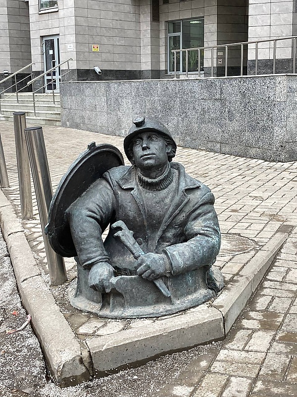 Скульптурная композиция показывает вылезающего из колодца чугунного человека, облаченного в простую рабочую одежду. На голове мужчины каска с фонариком, в одной руке слесарь держит большой разводной ключ.
