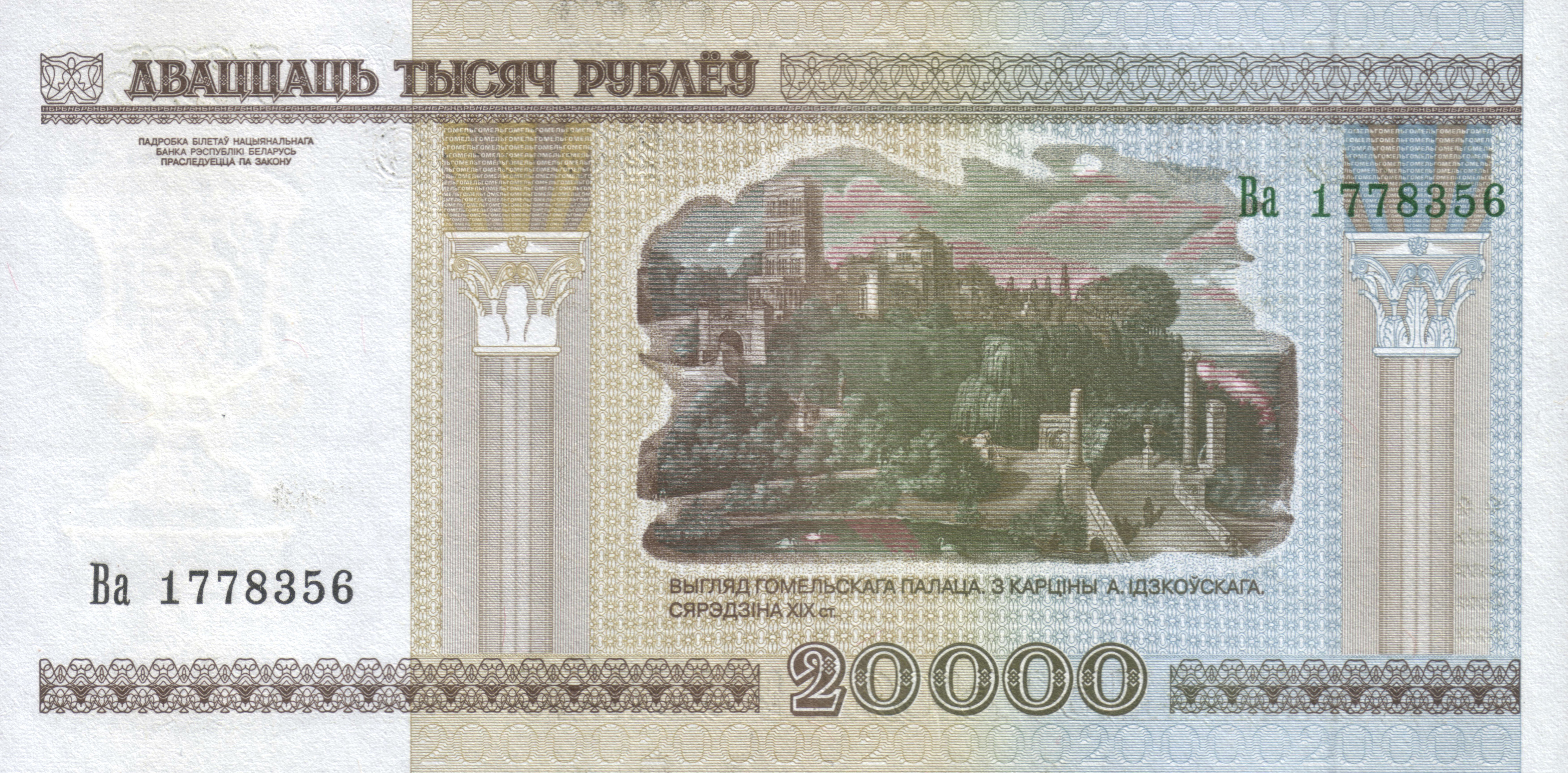| 1 декабря 2010 года | 20 000 рублей | 3 000 экз. | Изображение купюры в 20 000 рублей (Дворец Румянцевых-Паскевичей, цифровое обозначение номинала, микротекст, защитная нить), а также особого знака на поле водяного знака. | Надпись «НАЦЫЯНАЛЬНЫ БАНК РЭСПУБЛІКІ БЕЛАРУСЬ», «НБРБ» и элементы архитектурного оформления здания Национального банка Республики Беларусь, сквозь которые просматривается изображение двадцатитысячной купюры.