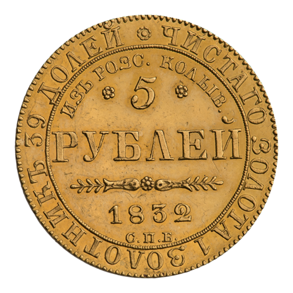 В 1832 году состоялся выпуск пятирублевой монеты, которая была выпущена в честь начала использования в монетном производстве золота, которое добывали на Колывано-Воскресенских приисках[1]. Это была русская памятная монета, которую отчеканили тиражом в 1000 экземпляров. На пятирублевой монете — золотом полуимпериале — была надпись «ИЗЪ РОЗС.КОЛЫВ.», что значило «из россыпей Колыванских». На лицевой стороне монеты изображен двуглавый гербовый орёл с короной, скипетром, державой[7]. Вес монеты — 6,54 г, из которых 6 г — чистого золота, диаметр — 22,6 мм[8].