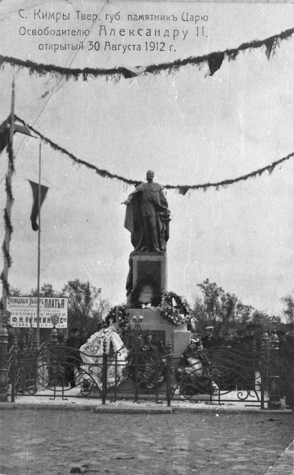 Памятник Царю-Освободителю в Кимрах был установлен в августе 1912 году. Основан в честь 50-летия отмены крепостного права. В феврале 1911 в Кимрах состоялся волостной сход, на котором было решено установить памятник царю-освободителю. Его прообразом стал памятник 1898 года в Московском кремле. Статуя императора была установле на пьедестале, ограждённом фигурной металлической оградой; Соборная площадь с окружающими её зданиями была украшена и иллюминирована; в честь открытия был дан салют и прошёл торжественный парад.[38] В 1918 году статуя царя была снесена и заменена на стеллу со звездой.[39]