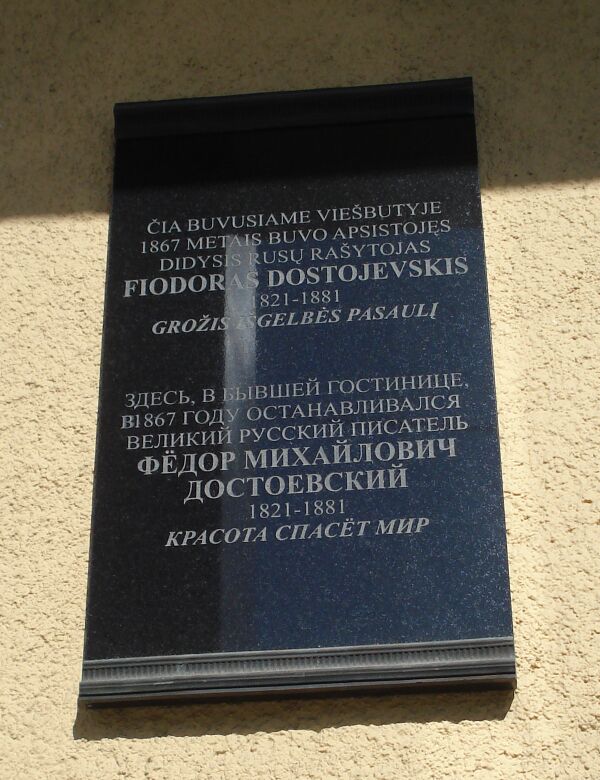 - 2006 — в Вильнюсе на здании гостиницы по улице Диджейи № 20, в которой в 1867 году по пути в Берлин останавливался Ф. М. Достоевский с женой Анной Григорьевной, была открыта мемориальная таблица скульптора Ромуальдаса Квинтаса. Впоследствии Достоевский кратковременно бывал там по пути из Петербурга в Западную Европу и обратно[13]