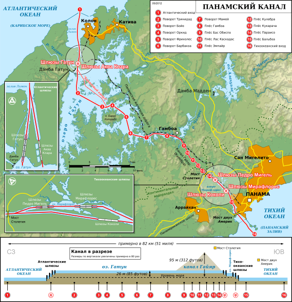 Длина — 81,6 км, в том числе 65,2 км[1] пересечения суши и 16,4 км по морскому каналу с углублением дна по Панамской и Лимонской бухтам (для прохода судов к глубокой воде), общая ширина — 150 метров (ширина исторических шлюзовых камер 33 метра[2]), глубина — 12 метров[3]. Официально открыт 12 июня 1920 года.