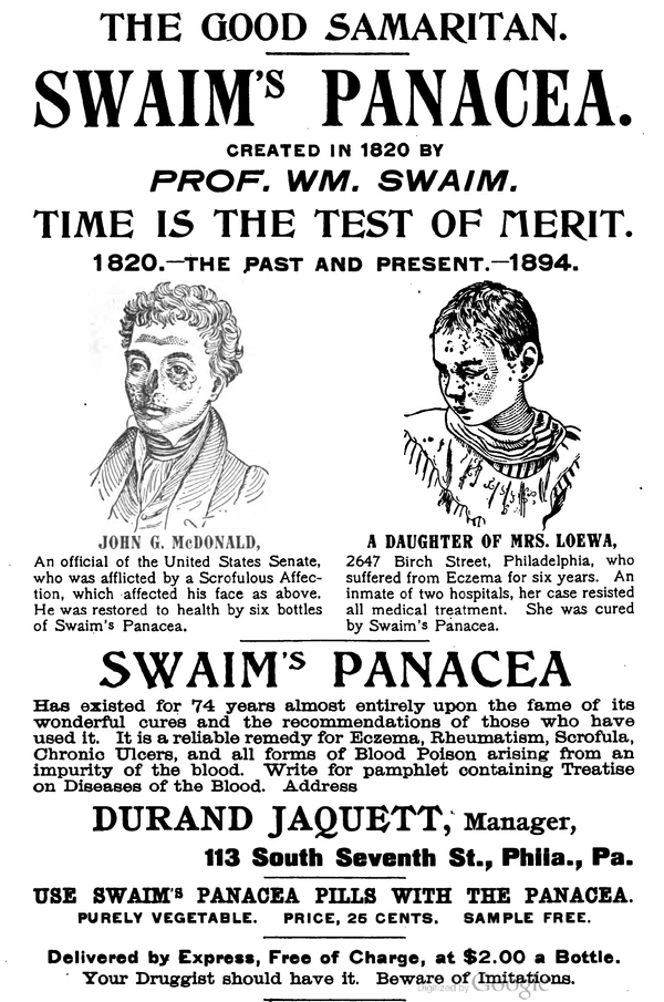 Ближе к 1820 году (хотя есть данные, что уже и к 1811-му) Суэйм переехал в Филадельфию, где и начал продавать собственную версию препарата. Он заручился поддержкой некоторых местных докторов, которые посчитали, что чудо-препарат действительно оказывает благотворное влияние на организм; власти также дали разрешение на продажу. Одну бутылку раствора он продавал за 3 доллара, что считалось высокой ценой. Позже он стал успешным бизнесменом, заработав около 500 млн долларов[4].