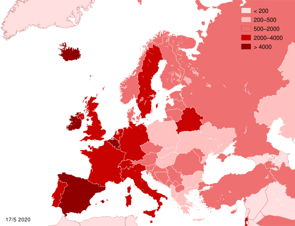 Карта подтверждённых случаев на душу населения по странам 100 и более случаев на 1000 жителей от 30 до 100 случаев на 1000 жителей от 10 до 30 случаев на 1000 жителей от 3 до 10 случаев на 1000 жителей от 1 до 3 случаев на 1000 жителей от 0,3 до 1 случая на 1000 жителей от 0 до 0,3 случаев на 1000 жителей Нет зарегистрированных случаев, нет населения или нет данных |