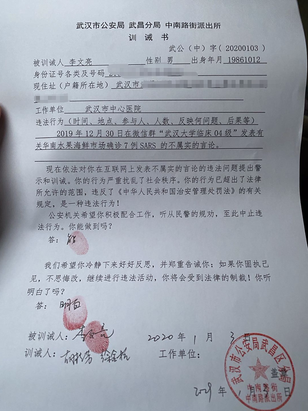 Утверждается, что 30 декабря 2019 года офтальмолог Ли Вэньлян первым сообщил о новом вирусе, аналогичном вирусу SARS, в беседе выпускников медицинского факультета Уханьского университета в чате WeChat, после чего был вызван в полицию и строго предупреждён о недопустимости распространения слухов.