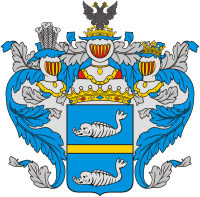- Герб, впоследствии графа, Никиты Ивановича Панина: щит, расположенный на орденской звезде, разделён горизонтально, широкой золотой полосой, деля щит на две синие части, в которых изображены по одному серебряному дельфину. Щит увенчан дворянским шлемом с дворянской на нём короной. Нашлемник: три страусовых пера. Вокруг щита орденская лента с тремя орденами, из которых центральный орден Святого Андрея Первозванного. Вокруг щита цепь ордена Святого Андрея Первозванного с орденом. Девиз <<ЗА ВЕРУ И ВЕРНОСТЬ>>.