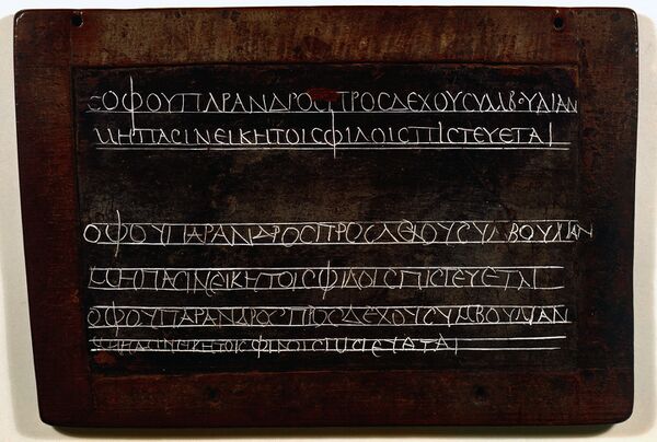 - Гробницы. Древнеегипетская религия с её заупокойным культом требовала снабжать покойных так называемой «Книгой мёртвых». Греки, поселившиеся в Египте, усвоили некоторые местные представления, в результате в гробницы стали полагать любимые книги покойного или магические тексты. Таким образом были обнаружены литературные тексты, древнейшим из которых были «Персы» Тимофея Милетского.