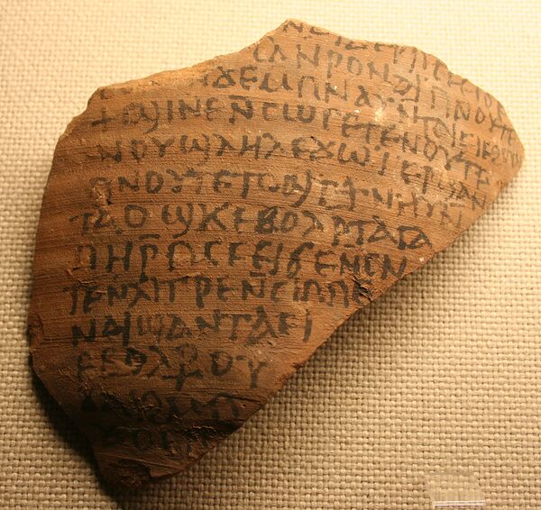 Остраконы (др.-греч. ὄστρακον) — глиняные черепки и осколки камня разных размеров, на которых иногда встречаются достаточно обширные тексты (например, монастырский книжный каталог на куске известняка)[40]; писали обычно на вогнутной стороне. Сохранилось несколько тысяч остраконов самого разнообразного содержания. Подавляющее их большинство — налоговые квитанции, счета, расписки. К другим категориям текстов на остраконах относятся частные записки и письма, школьные упражнения, реже — литературные и религиозные тексты. Наиболее массовое распространение остраконы получили в римское время и продолжали использоваться вплоть до арабского завоевания. Кроме греческих, встречаются демотические и коптские остраконы, значительно реже — латинские, находимые в расположениях армии. Встречаются и двуязычные тексты, демотическо-греческие или греческо-коптские. Наиболее массовые находки были сделаны в Оксиринхе. Остраконы и папирусы, как правило, публикуются в одних и тех же изданиях, в рамках одних и тех же находок и музейных коллекций[41]. Значение остраконов как важнейшего источника по социально-экономической истории греко-римского Египта было показано ещё к 1900 году в работе У. Вилькена «Греческие острака из Египта и Нубии» (рецензию на неё писал М. И. Ростовцев)[15].