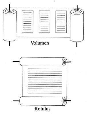Исследователи-папирологи в первую очередь имеют дело с папирусными свитками и отдельными листами; значительно реже — с папирусными кодексами[20]. Стандартный термин — греч. βιβλίον — обозначал как отдельный свиток, так и сочинение, состоявшее из нескольких свитков-книг. Позднее данный термин стал обозначать текст, обладающий тематической законченностью и единством, тогда как свитки, составляющие отдельные части, «книги», стали обозначаться словом «том» (др.-греч. τόµος); в период раннего средневековья словом «том» обычно обозначали документы, написанные на папирусе[21].