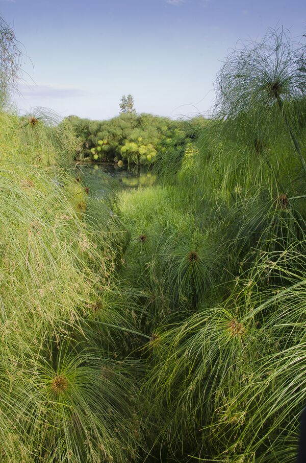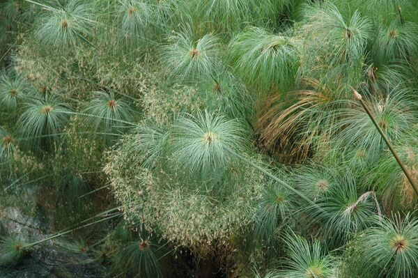 Биологически Cyperus papyrus относится к семейству Осоковые, которое включает почти 4000 травянистых растений. Папирус — многолетнее растение, естественным ареалом которого являются пресноводные болота; стебель трёхгранный, поддерживается переплетёнными корневищами и достигает 4—6 метров в высоту; верхушка имеет форму зонтика[32]. По мнению А. Бюлова-Якобсена, папирус не являлся эндемичным видом для долины Нила и был искусственно перенесён из Тропической Африки ещё в глубокой древности. После прекращения его возделывания Cyperus papyrus, по-видимому, исчез; исследованиями 1960-х годов были обнаружены некоторые сохранившиеся разновидности в озёрах Вади-Натрун, но не в нильской долине. А. Бюлов-Якобсен утверждал, что вновь культивирование папируса в Египте началось в 1872 году, когда образцы из Люксембургского сада в Париже были высажены в саду Каирского музея[25]. Развитию современной индустрии папируса в Египте (в том числе туристической) способствовал в 1960-е годы известный общественный деятель и дипломат Хасан Рагаб[33], посевные материалы для его Института папируса были привезены из Сицилии[25] (по другим сведениям — из Судана)[34][35].