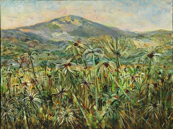 Картина представляет собой малоформатный пейзаж горизонтального формата. Основная часть композиции занята густыми зарослями папируса, чьи светло-зелёные с белесоватым оттенком зонтичные соцветия на длинных стеблях выделяются на переднем плане. На дальнем плане левее центра высокий пологий холм, за которым и правее просматриваются холмы меньших размеров. Небо выполнено в светло-голубых тонах с розоватыми оттенками у горизонта. Цветовая гамма картины спокойная, с преобладанием зеленовато-коричневатых тонов. В верхней части изображения сквозь красочный слой заметна фактура холста, а в нижней части читаются длинные, сравнительно тонкие мазки густой краски.
