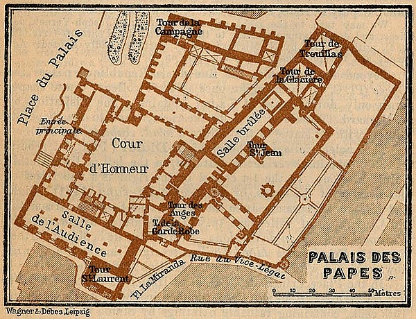 Первые авиньонские Папы — Климент V и Иоанн XXII — жили при доминиканском монастыре, и лишь при Бенедикте XII (1334—1342) началась реконструкция старого епископского дворца, продолженная его преемниками. Папский дворец был выстроен на северной окраине города на холме со скалистыми склонами, откуда открывался вид на реку Рону. Сооружение состояло из двух частей — Старого и Нового дворцов. К моменту завершения строительства их общая площадь составляла 11 тыс. м². При этом, на возведение Папского дворца шла большая часть доходов папства.