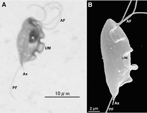- Tritrichomonadea имеют от 0 до 5 жгутиков, супра- и инфракинетосомальным телом (за исключением представителей семейства Dientamoebidae). Коста, если присутствует, с исчерченностью A-типа. Могут быть одноядерными или двухъядерными. Типичные представители: Tritrichomonas, Dientamoeba, Histomonas.