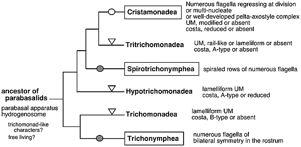 - Для Trichomonadea характерны 2—6 жгутиков, коста с исчерченностью B-типа, одиночный кариомастигонт (ядро и ассоциированные с ним кинетосомы), отсутствие инфракинетосомального тела. В этот класс, среди прочих, входят единственные представители парабазалий, ведущие свободноживущий образ жизни. Типичные представители: Trichomonas, Pentatrichomonas, Cochlosoma.