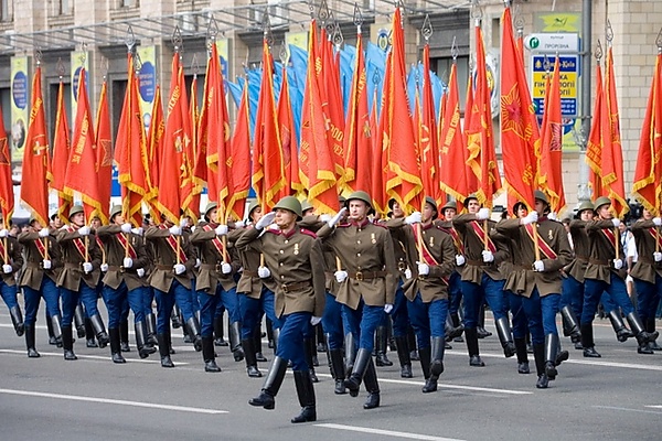 Военные машины и солдаты в форме Советской Армии прошли по Крещатику. Осматривать парад прибыл начальник Генерального штаба Вооруженных сил генерал армии Иван Свида. Командующий сухопутными войсками Украины генерал-полковник Геннадий Воробьев командовал парадом. Президент Украины Виктор Янукович выступил с юбилейным обращением. В параде приняли участие 2500 военнослужащих Вооруженных сил Украины, России и Белоруссии[2]. 17 военных оркестров приняли участие в параде под командованием начальника военно-музыкального отдела Генерального штаба Вооруженных сил Украины генерал-майора Владимира Деркача.