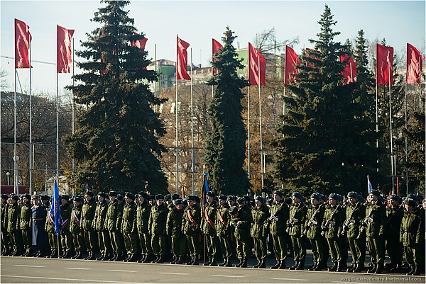 Празднование советской годовщины прошло по старой программе… Ворошилов здесь, так как похоже, что занимается формированием в районах, расположенных к востоку от Самары, частей для фронта. На параде показали сборные части около 2-х дивизий пехоты, артиллерия — скудная и старая, лошади — деревенские, истощённые, авиация — старая и учебных моделей; люди — из Сибири и различных народностей. Говорил Ворошилов: повторение лозунгов Центрального Комитета: долг, война, призыв к увеличению производства и борьбе.