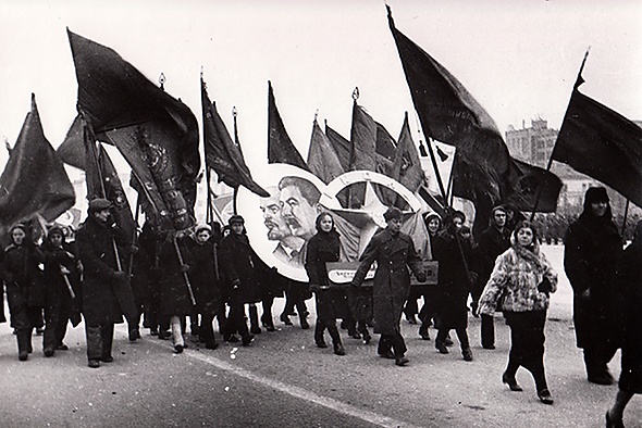 Воюющие россияне по-прежнему любят эти массовые церемонии. Вот большой парад во временной столице Куйбышеве, где отмечают революционный праздник.