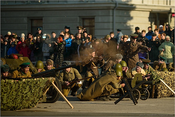 Оригинальный текст (англ.)[показатьскрыть]The battling Russians still love those mass ceremonies. Here's a big parade in Kuibyshev, provisional capital, celebrating a revolutionary holyday.