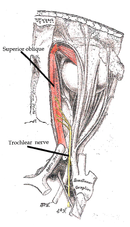 Чтобы компенсировать двойное видение в результате слабости верхней косой мышцы, пациентам приходится наклонять голову вниз и в сторону, противоположную поражённой мышце.