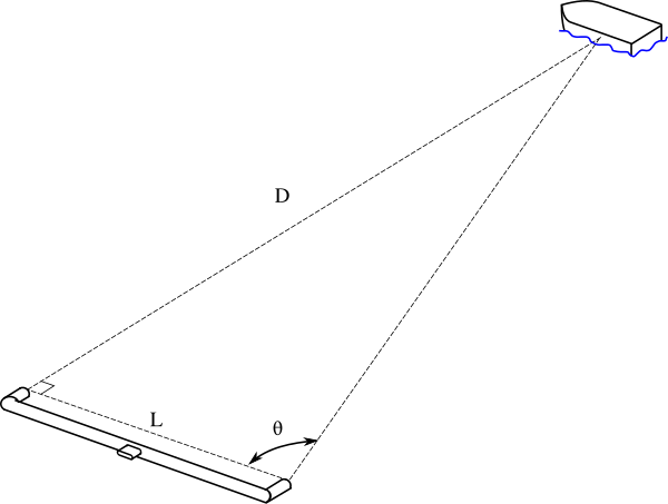 Зная расстояние между точками наблюдения L (базис) и угол смещения α, можно определить расстояние до объекта: