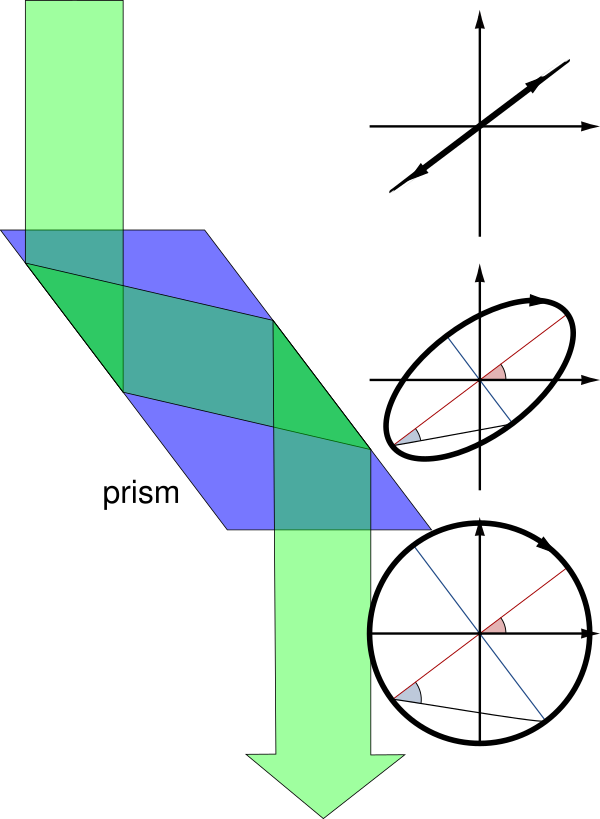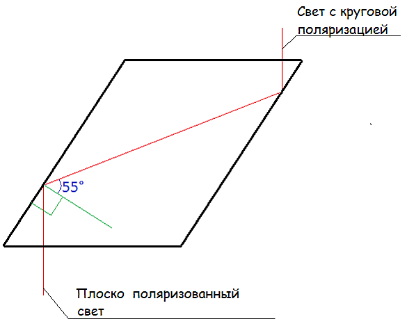 При отражении света внутри стекла отражённый луч состоит из двух лучей с s- и p-поляризацией. Френель нашёл, что при отражении от поверхности стекла под углом, близким к 55°, разность хода этих лучей равна Очевидно, что после двух таких отражений лучи будут иметь разность хода в а, значит, свет будет поляризован по кругу.
