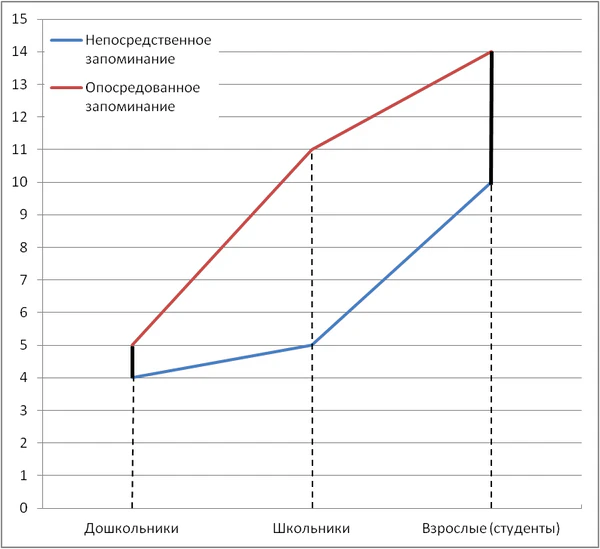 Введение в эксперимент второго ряда стимулов-знаков (карточек с картинками) не повышает эффективности запоминания у дошкольников: запоминание все еще остается непосредственным. На следующем этапе развития запоминания введение стимулов знаков у школьников значительно повышает эффективность запоминания: это момент наибольшего расхождения показателей второй (непосредственное запоминание) и третьей (опосредованное запоминание) серии. Однако с этого момента темп возрастания показателей в обеих сериях изменяется: происходит более медленный рост показателей внешне опосредствованного запоминания, он как бы продолжает темп развития непосредственного запоминания. На следующем этапе (взрослые) за счет вращивания внешних стимулов-средств осуществляется переход к внешне непосредственному запоминанию и показатели двух серий снова сближаются[1].