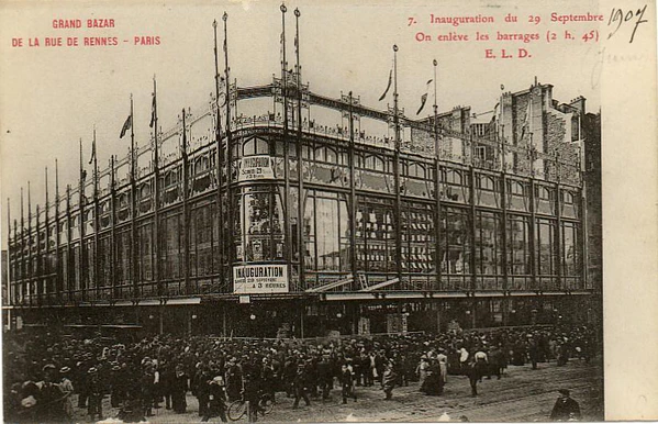 Современный универмаг был создан в Париже в 1852 году, незадолго до Прекрасной эпохи , когда Аристид Бусико открыл магазин под названием Ау Бон Марше. В универмаге были использованы инновационные средства маркетинга и ценообразования, в том числе почтовые каталоги и сезонные распродажи. Когда в 1852 году Бусико открыл магазин, он имел доход в 500 000 франков и двенадцать работающих сотрудников. Двадцать лет спустя в нём работало 1 825 сотрудников с доходом более 20 миллионов франков. С 1869 года Boucicault начал строить гораздо большие магазины с железным каркасом, центральным внутренним двором, покрытым застекленной крышей. Эти здания стали прообразом для других универмагов в Париже и по всему миру[6].