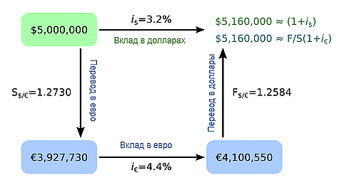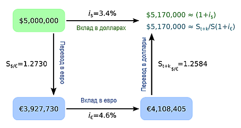 Имеем равенство между долларовой доходностью по вкладу в долларах и вкладу в евро .