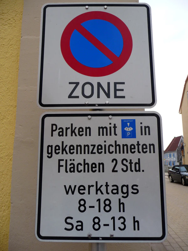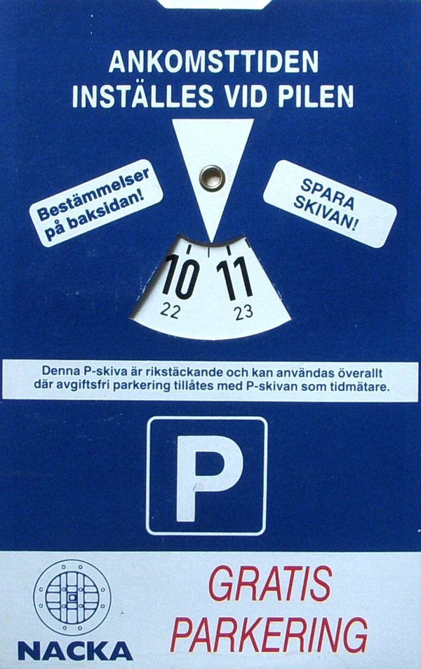 В Германии и в скандинавских странах парковочный диск представляет собой картонный или пластмассовый лист размером 11х15 см со встроенным циферблатом в форме диска (отсюда и название). Путём вращения диска можно установить на циферблате текущее время с точностью до 30 минут. В местах, где использование парковочного диска для стоянки автомобилей предписано соответствующим дорожным знаком (как правило, речь идет о парковочных местах в густонаселенных городских районах, где наблюдается дефицит парковочных мест), при оставлении автомобиля на стоянке необходимо установить время начала парковки на циферблате диска и положить диск на видном месте за лобовым стеклом автомобиля. При этом дополнительная надпись на дорожном знаке предписывает максимальную продолжительность стоянки на одном месте, а также время суток, когда использование парковочного диска вообще необходимо (чаще всего это дневное время в будние дни, когда движение на дорогах интенсивнее всего). При установке времени на диске разрешается округлять время начала стоянки до получаса в большую сторону. Сотрудниками дорожной инспекции или полиции периодически проводятся обходы автостоянок, и при отсутствии парковочного диска или при истекшем или неправильно установленном на нем времени парковки на владельца автомобиля может быть наложен штраф.