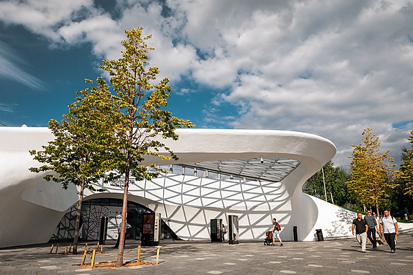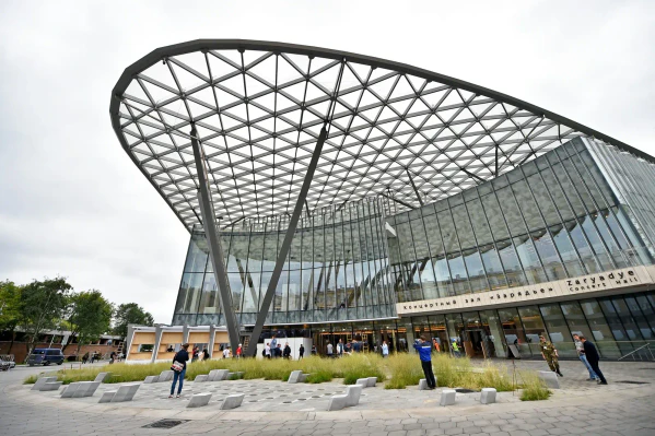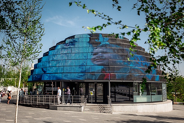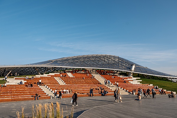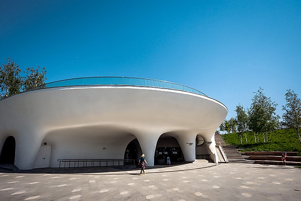 Концертный зал «Зарядье» — многофункциональный комплекс, открытый 8 сентября 2018 года. Со стороны Китайгородского проезда здание полностью остеклено, со стороны парка — встроено в холм, который является частью открытого Большого амфитеатра[25][26].