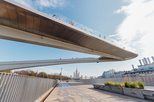 Парящий мост — одна из знаковых достопримечательностей парка. Сооружение в виде бумеранга частично расположено над Москвой-рекой; длина моста составляет около 244 метров, а общий вес конструкции — 3700 тонн. Смотровая площадка моста расположена на высоте 15 метров над уровнем реки, откуда открываются панорамные виды на Кремль, собор Василия Блаженного, Красную площадь и другие исторические достопримечательности Москвы[12][13][14].