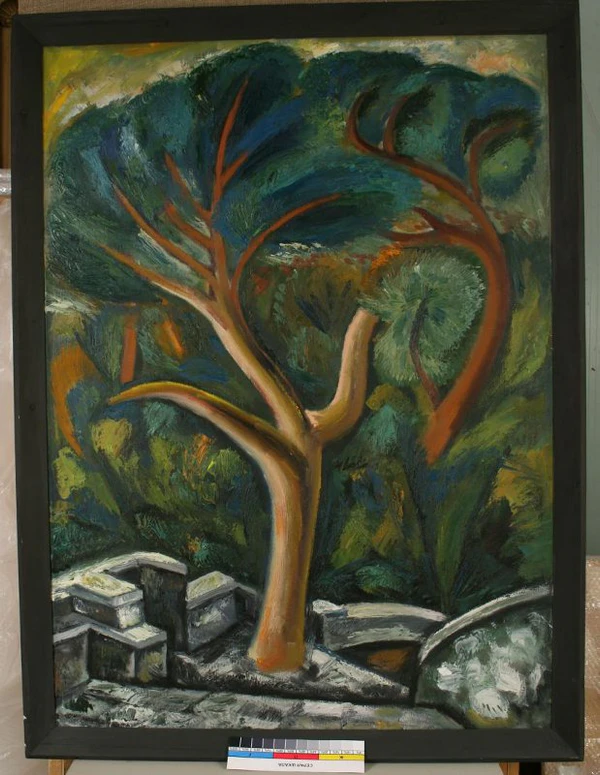 В центре композиции находится спуск лестницы, ограждённой каменными перилами беловато-серого цвета. На нижней площадке выделяется дерево с изогнутым стволом, двумя боковыми толстыми ветвями и широкой сине-зелёной кроной. Второй план занимает сплошная стена зелёных насаждений парка, а справа изображён изогнутый красновато-коричневый ствол дерева. Картина выполнена в жанре пейзажа.