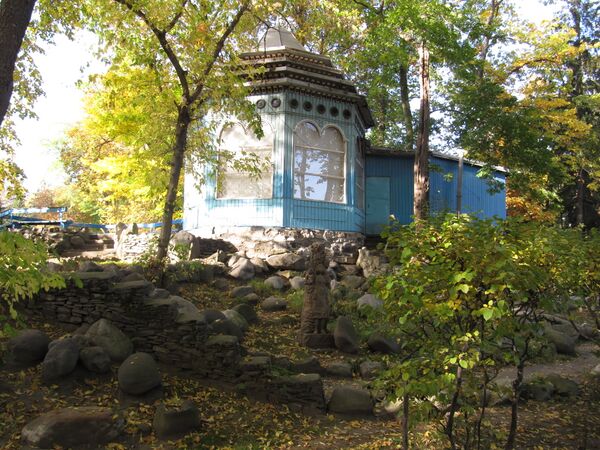 С момента открытия парка возле прудов располагался так называемый Восточный павильон, представлявший собой комплекс деревянных сооружений, выполненных в мавританском стиле. В середине 1930-х годов здание было снесено, а на его месте построен лекторий (позже — читальный зал). В середине 1960-х годов данное здание также было снесено, а на его месте построено здание ресторана «Нар», который действовал до 1986 года. В 1986 году ресторан переоборудовали в «Центр молодежи», а оказание услуг общепита перестало быть его главной функцией. В конце 1980-х фасады здания были перестроены, а Центр молодежи переименовали в Республиканский выставочный центр «Иртекс», где проводились выставки драгоценных камней и предметов искусства. Однако, в данном качестве центр проработал недолго, и уже к началу XXI века прекратил функционирование. В 2009 планировалось передать здание в собственность Государственного центра современного искусства[6]. Был разработан проект реконструкции здания и разобран фасад здания. Однако, проект так и не удалось осуществить, а заброшенное в течение многих лет здание пришло в аварийное состояние. Весной 2021 года в ходе реконструкции парка здание было полностью демонтировано, а не его месте разбит цветник.