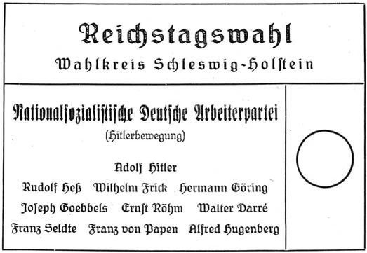 Единый список кандидатов в депутаты был составлен Министерством внутренних дел при участии Национал-социалистической партии. Помимо нацистов, в него были включены известные политические и общественные деятели, представлявшие распущенные правые партии — Немецкую национальную народную партию, Немецкую народную партию, Партию Центра, Баварскую народную партию.