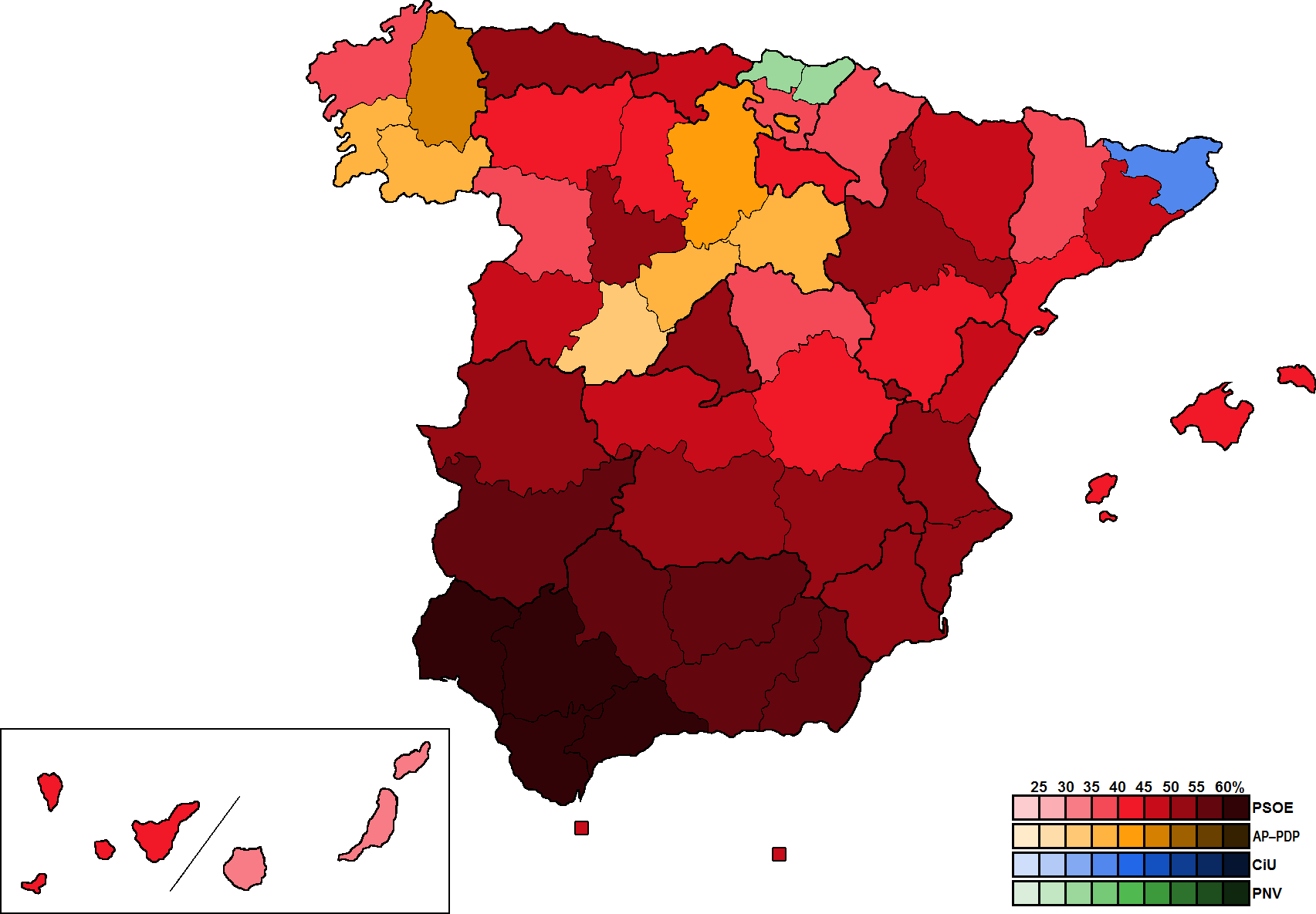 Социалисты победили в 40 провинциях, а также в Сеуте и Мелилье. Народная коалиция выиграла выборы в 7 провинциях (Луго, Оренсе, Понтеведра, Авила, Сеговия, Сория и Бургос). Баскские националисты первенствовали в Бискайе и Гипускоа. "Конвергенция и Союз занял первое место в Жироне.