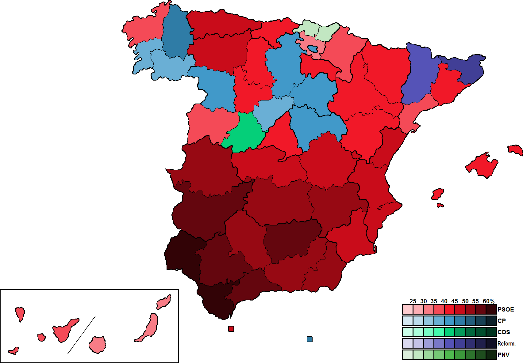 Социалисты победили в 38 провинциях, а также в Сеуте. Народная коалиция выиграла выборы в 7 провинциях (Луго, Оренсе, Понтеведра, Самора, Сеговия, Сория, Бургосе и Гвадалахаре), а также в Мелилье. Баскские националисты первенствовали в Бискайе и Гипускоа. "Конвергенция и Союз занял первое место в Жироне и Льейде. Демократический и социальный центр победил в Авиле.